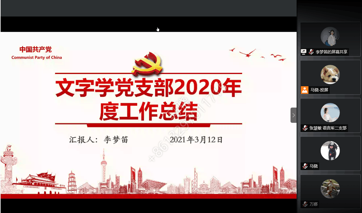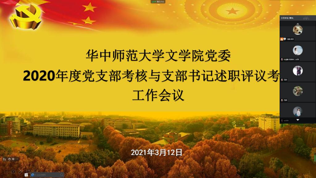 (通讯员 马骁)3月12日,文学院党委委员(扩大)会议暨2020年度党支部考核和支部书记抓党建述职评议考核会议于腾讯会议线上平台召开。学院党委委员、党支部书记、各党支部党员代表和群众代表共65人参加会议,会议由文学院党委副书记秦伟主持。