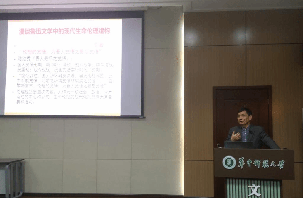 讲座在谭老师讲述自己与华中师大学缘关系的亲切氛围中拉开序幕。进入正题后,谭老师围绕“鲁迅文学中的现代生命伦理建构”的中心论题,通过分析鲁迅文学对启蒙、疾病、身体等主题的书写,探讨鲁迅关于生命问题的思考,指出鲁迅反对割臂疗亲恶习、提倡幼者本位、批判酷刑残虐、肯定安乐死等观念都体现着新文学在建构现代生命伦理方面的努力,也是他对《新青年》关于发起伦理觉悟这一启蒙方略的自觉呼应。