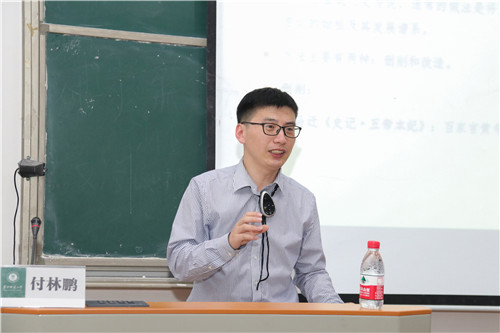 最后,付林鹏向同学们介绍了历史的神话化与上古文化研究这两个主要研究方向,并举出了两个例证。一是伯禹腹鯀,这是母系向父权制过渡的标志性事件;二是夏后启盗《九招》,可以从《山海经》看到家天下开创者的历史风貌。付林鹏风趣幽默的解读不仅调动了同学们的积极性,也给同学们相关领域的研究提供了思路。