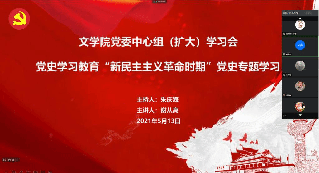(通讯员 马骁)5月13日上午,文学院党委理论学习中心组2021年第2次(扩大)学习会议在腾讯会议线上召开,对“新民主主义革命时期”进行了党史专题学习。学院党委委员、领导干部、党支部书记参加学习会,会议由院党委书记朱庆海主持,马克思主义学院教授、博士生导师谢从高主讲。