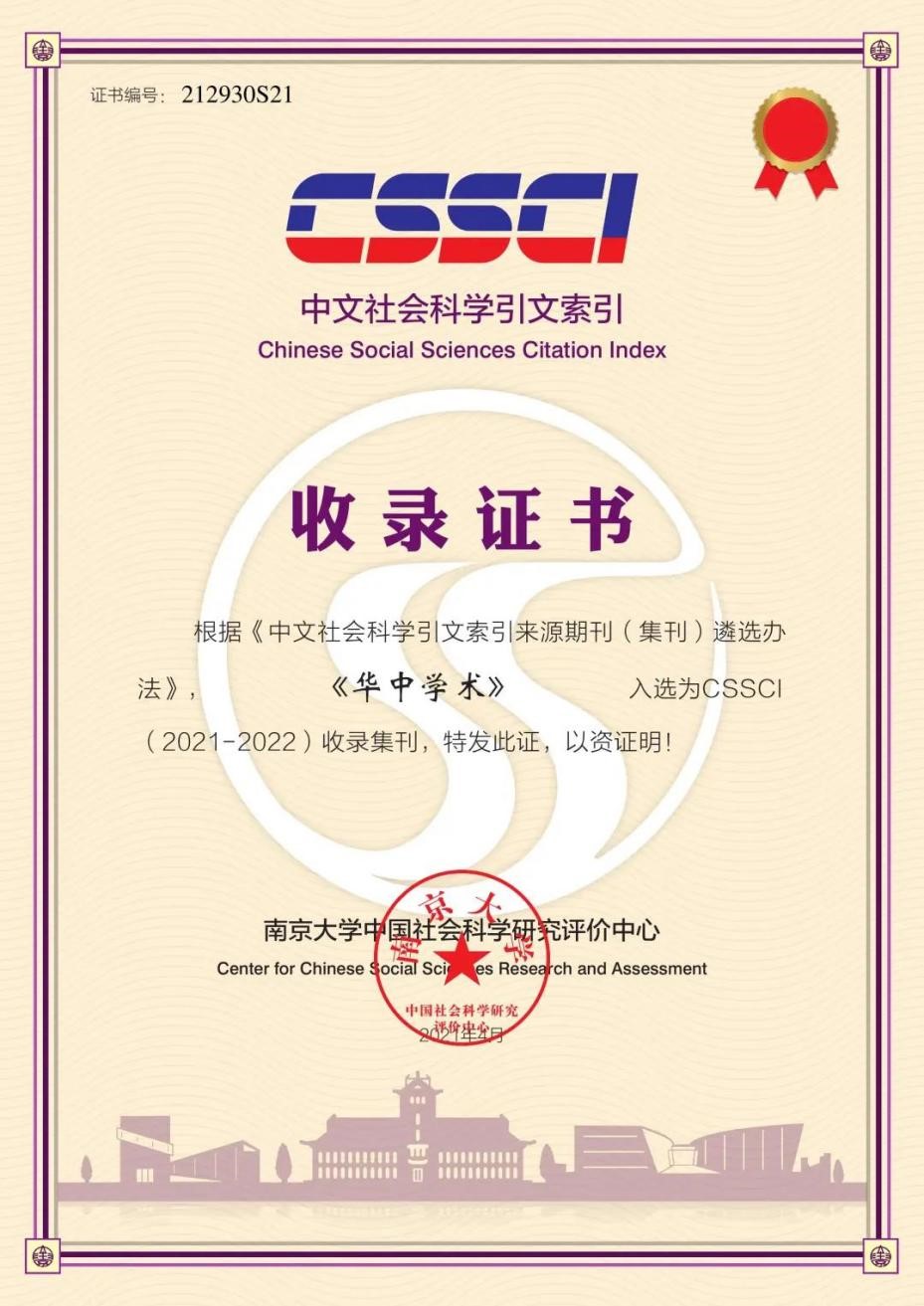 据悉,文学院《华中学术》编辑部于2021年5月20日收到了南京大学中国社科科学评价中心发来的最新收录证书。《华中学术》再度入选CSSCI收录集刊,这是继2013年该刊首度入选以来连续八年获得此项荣誉。