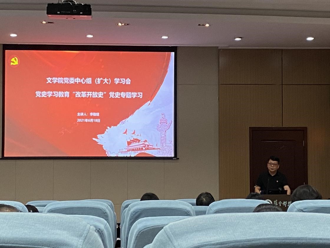 (通讯员 马骁)6月18日下午,文学院党委理论学习中心组2021年第5次(扩大)学习会议在文学院一楼报告厅召开,对“改革开放史”进行了党史专题学习。学院全体教职工参加学习会,会议由院党委副书记徐福刚主持,马克思主义学院教授、博士生导师李敬煊主讲。