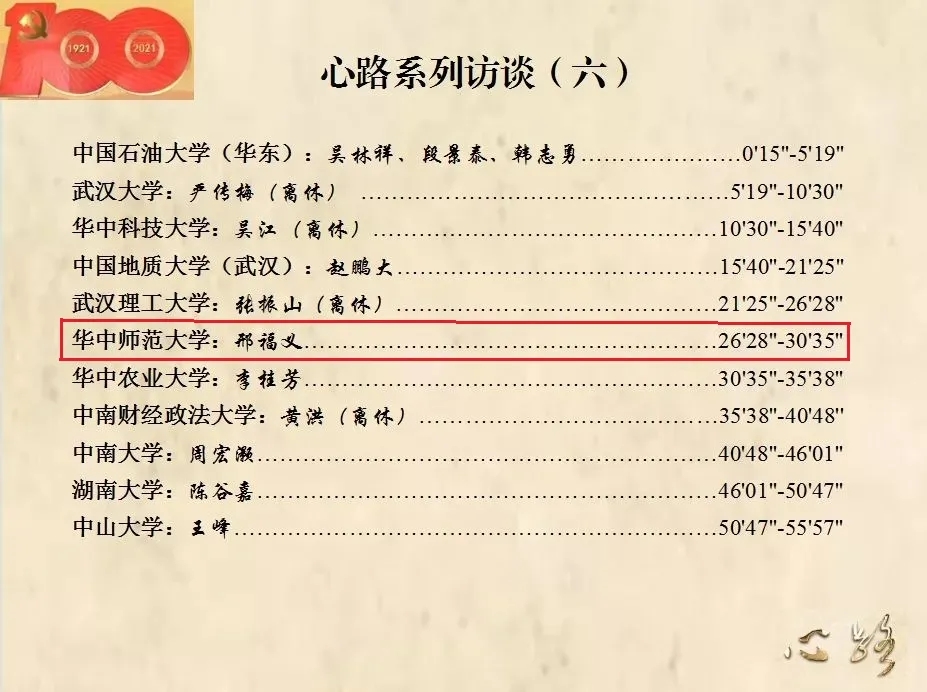 为庆祝中国共产党成立100周年,教育部离退休干部局面向部直属系统老同志开展了“与党同呼吸、共命运”文章视频征集活动。我校资深教授邢福义老师的育人治学视频被选中编入第六集,并在教育部老干部之家官方公众号展示。此次活动部机关拍摄个人访谈视频16个,63所直属高校报送个人访谈视频65个,1个直属单位报送访谈视频1个。82个完整版访谈视频现已剪辑制作成《心路——教育部直属系统老同志庆祝中国共产党成立100周年系列访谈》 (一至七) 7集。