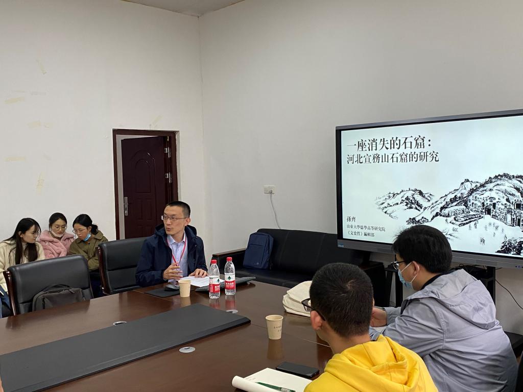 (通讯员 郝楠)2021年10月22日下午,“文本世界的内与外”系列讲座之一,主题为“一座消失的石窟:河北宣务山石窟研究”的学术讲座在文学院三楼会议室举行。本次讲座邀请到了山东大学儒学高等研究院孙齐副研究员主讲,由华中师范大学文学院林岩教授主持,华中师范大学文学院罗昌繁、李程、苏小露、卜兴蕾、何安平、王楚等老师出席。