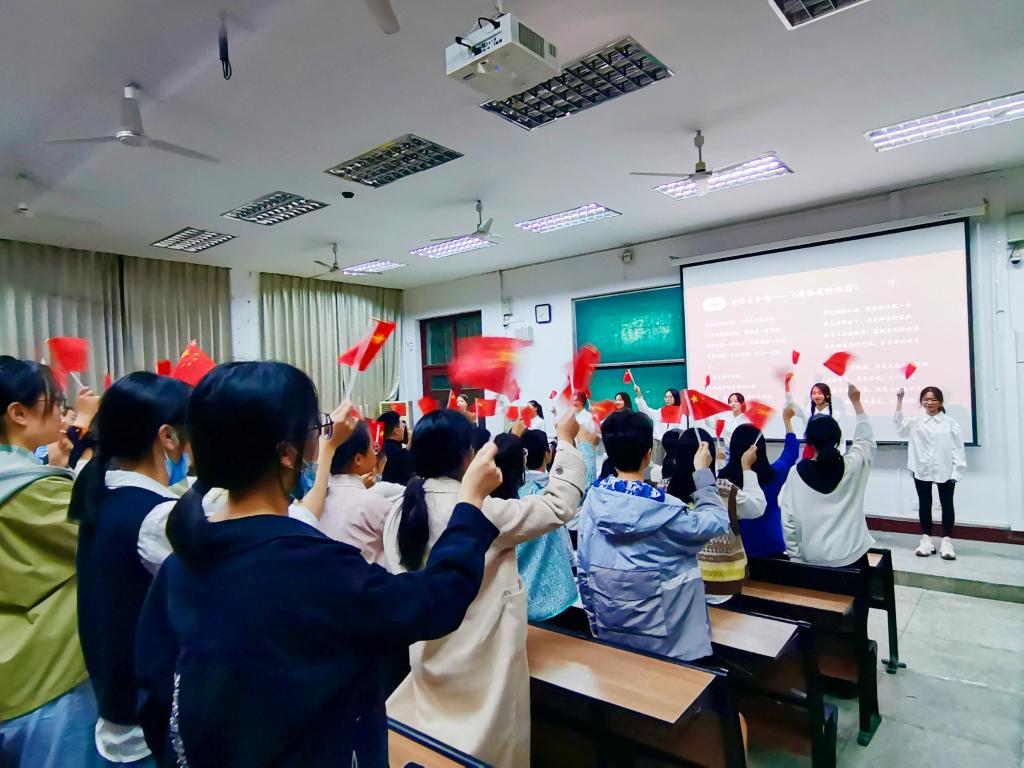 接下来进入红歌传唱环节。华师文院21级学生会主席团带领同学们合唱了歌曲《没有共产党就没有新中国》、《我和我的祖国》。同学们全体起立,饱含感情地唱起红歌,手中鲜艳的小红旗整齐地挥舞着,划出了充满敬意与爱意的弧度。大家脸上带着认真,带着庄重,带着感动,这是对过往付出一切成就祖国的先辈们的敬仰;这是对日益富强的祖国的自豪;这是对身为新时代青年所肩负的任务的深深思考。整齐的歌声在教室中飘荡着,美妙的音符在同学们的心中激荡着。“红歌传唱”让同学们唱出了心中的爱国主义精神和敬党爱党信念。
