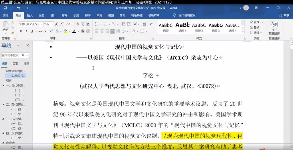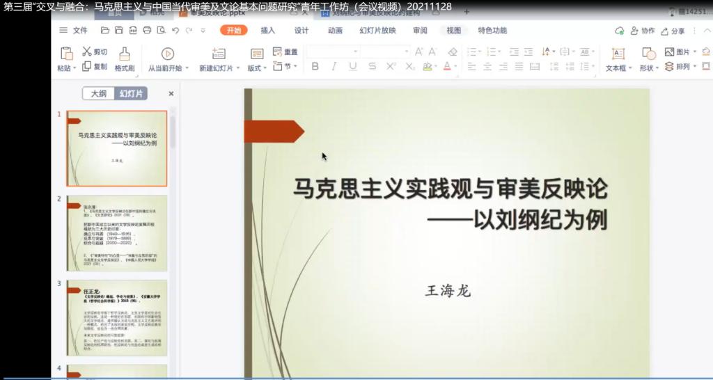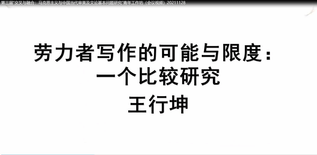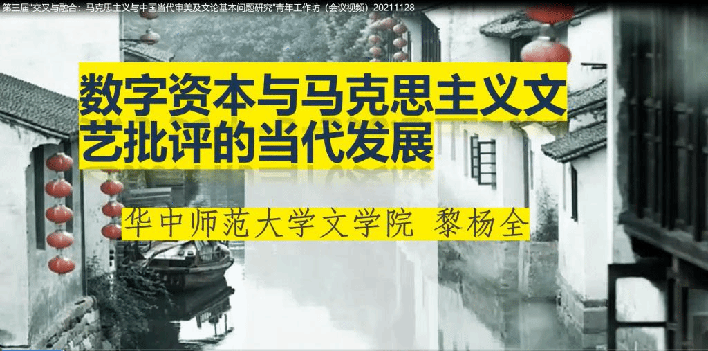 (通讯员 谢佩瑾 周雨超)2021年11月28日,第三届“交叉与融合:马克思主义与中国当代审美及文论基本问题研究”青年工作坊在线上举办。会议由华中师范大学文学院和中国语言文学一流学科“马克思主义文学批评”青年学术创新团队主办。来自武汉大学、华中科技大学、中国政法大学、华中师范大学、华中农业大学、天津师范大学、中国石油大学、汕头大学、河南大学、湖北大学等全国各高校的约五十位青年学者参加了此次会议。