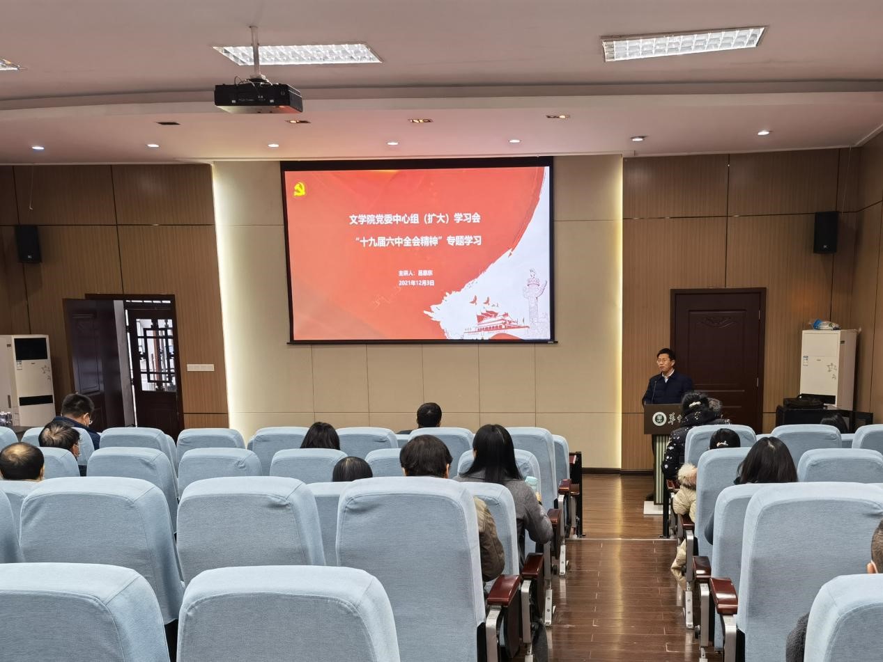 (通讯员 万铭汐)12月3日下午,文学院党委理论学习中心组2021年第9次(扩大)学习会议在文学院一楼报告厅召开,对“十九届六中全会精神”进行了党史专题学习。学院全体教职工参加学习会,会议由院党委书记朱庆海主持,马克思主义学院副教授吕惠东主讲。