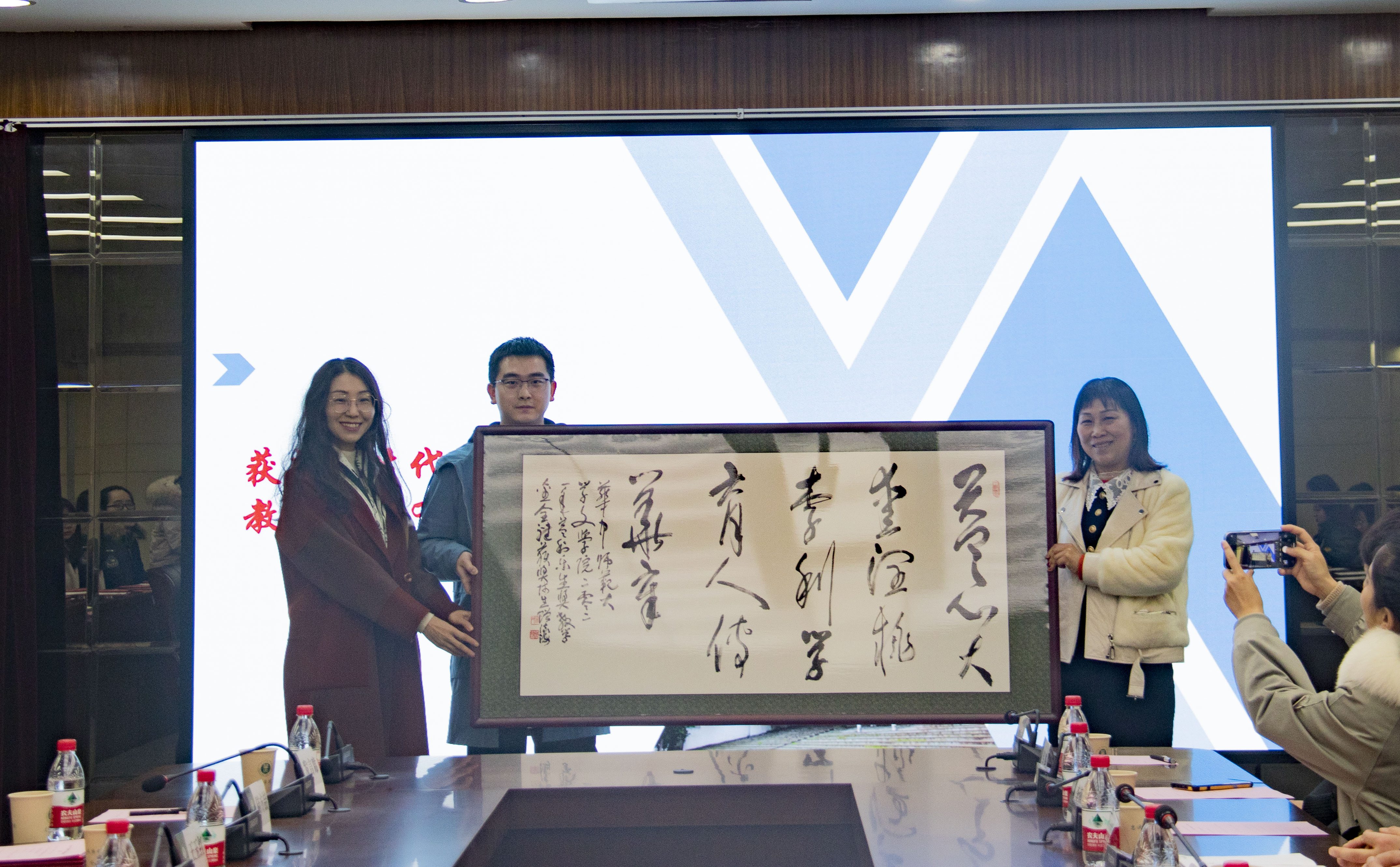获奖教师代表杨晓帆和学生代表周旺章分别作了发言。杨晓帆结合学生面对后疫情时代的困惑,以及徐莉女士在香港的一段中文教学经历,阐释了自己对文学教育的思考,最后表达了对香港益利乐生教育基金有限公司的感谢,表示将以更饱满的热情投入文学院一流学科建设。周旺章则认为这不仅是物质上的帮助,更是精神上的鼓舞,徐莉女士热心公益的事迹激励着自己在志愿服务的道路上不断前行,未来也将继续刻苦学习,回馈学校,回报社会。随后,获奖师生代表向香港益利乐生教育基金有限公司献上书法作品“益心大爱润桃李,利学育人传华章”,以此表达诚挚的感谢。