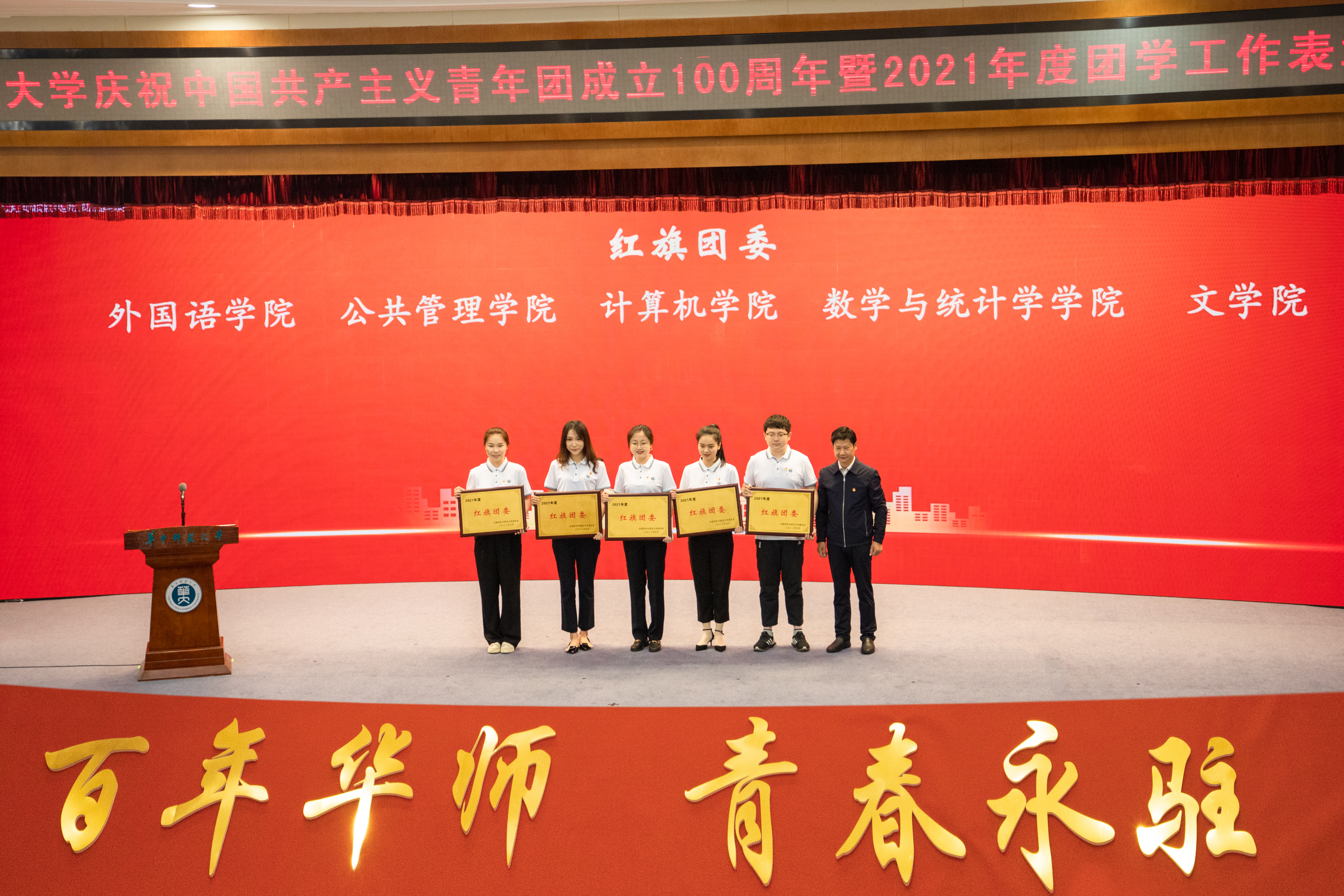 5月11日上午,华中师范大学庆祝建团100周年暨2021年度团学工作表彰大会在科学会堂一楼报告厅举行。大会对2021年度团学工作先进集体和先进个人进行表彰,文学院获评2021年度“学生工作先进单位”和“红旗团委”两项荣誉称号。