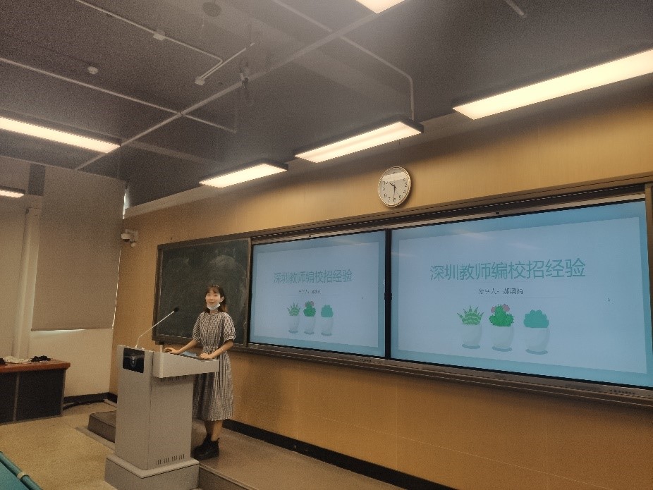 本次交流会共有六位同学分享经验。汉语国际教育专业的郝澳娟同学分享了教师应聘经验,详细介绍了深圳地区的招聘情况,提出许多可能遇到的问题,并指出教师编在深圳地区的重要性。将赴英国爱丁堡大学读研的陈子澈同学则分享了自己对语言学的学习心得,介绍出国留学的经验。