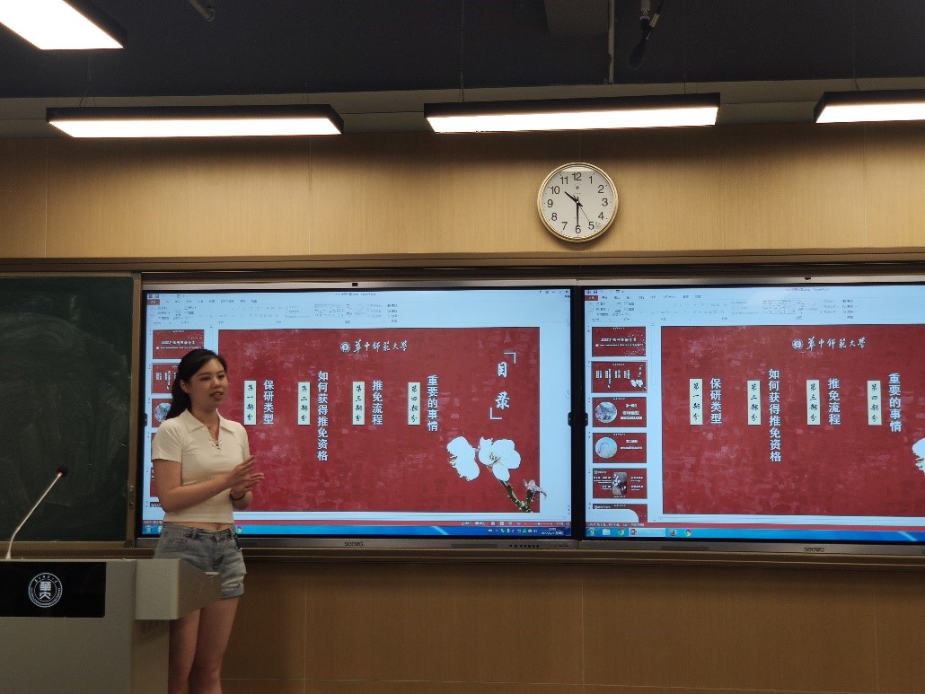 考取了本校研究生的林歆玥同学从心态、备考准备、运气三方面给出了许多独到的见解,并建议同学们结合自己的实际情况,将听取的经验运用到最大化。参加研究生支教团的黎书宏同学向同学们解释了何为研究生支教团,介绍了参与者需要具备什么条件、如何提前准备以及能够从中收获什么,对这条发展路径进行了详尽的剖析。