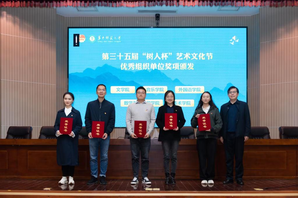 活动第一项,学生工作部副部长李刁宣读“树人杯”艺术文化节活动结果,文学院、音乐学院、外国语学院、数学与统计学学院、美术学院荣获优秀组织单位奖项。陈迪明副书记颁发奖项,文学院团委书记倪菁作为代表上台领奖。“树人杯”艺术文化节举办十余场校院两级活动,以“百年逐梦·青春礼赞”为主题,丰富校园文化,展现艺术风采。文学院参与举办原创歌曲歌词大赛、超级新生等各类艺术文化活动,文院学子积极参与,共享文化之美,共育艺术之风。