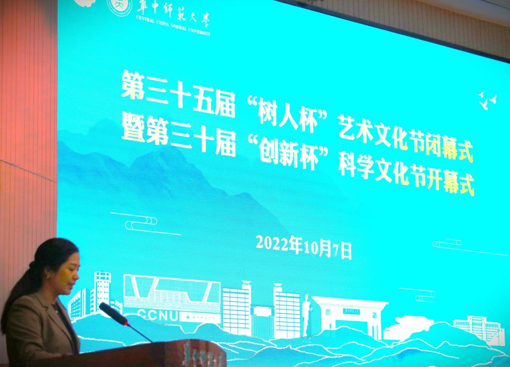 (通讯员 付杨 丁丽娜 于洋)10月7日下午,第三十五届“树人杯”艺术文化节闭幕式暨第三十届“创新杯”科学文化节开幕式在科学会堂一楼报告厅如期举行。本次活动由共青团华中师范大学委员会主办。华中师范大学校长郝芳华、校党委副书记陈迪明、校党委宣传部部长王长华、校党委学生工作部副部长李刁、研究生院副院长叶飞、马克思主义学院副院长李芳、邵彦涛以及校院两级专兼职团干、校级学生组织和各学院(学部)学生代表出席本次活动。校团委书记麻旎担任主持人。