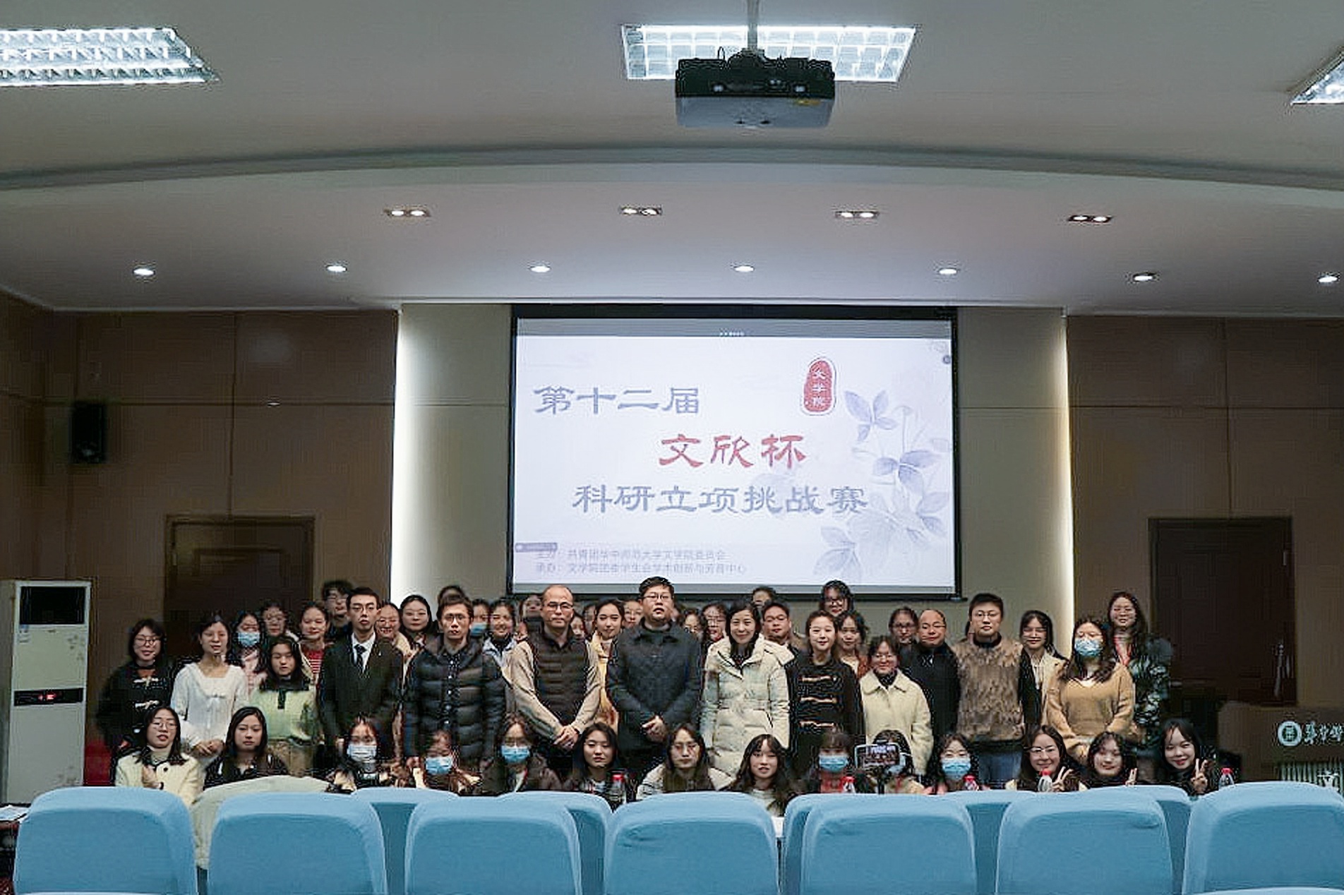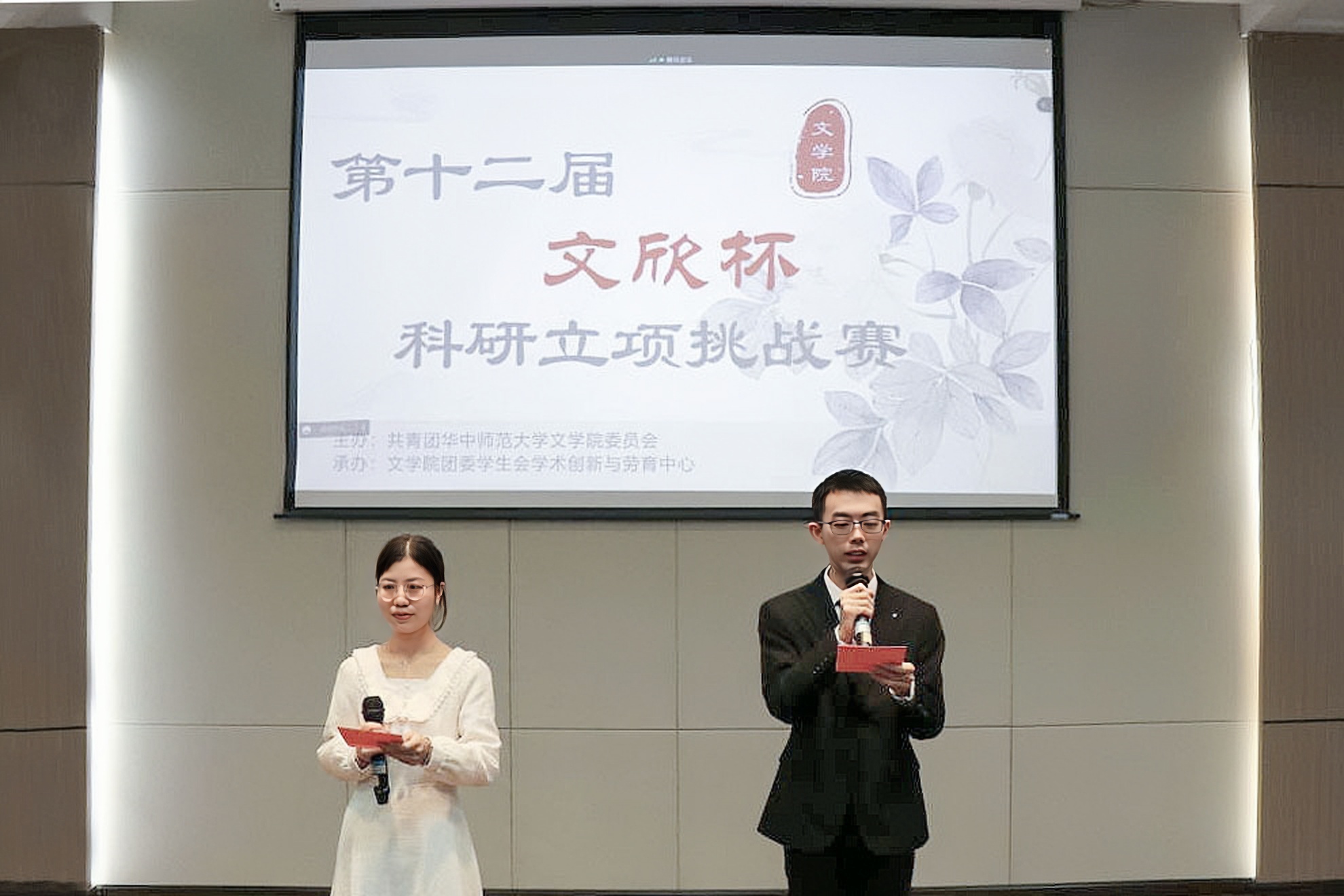 (通讯员 陈知行 陈潇瑜)12月3日上午9时,由共青团华中师范大学文学院委员会主办,文学院团委学生会学术创新与劳育中心承办的第十二届“文欣杯”科研立项挑战赛决赛在文学院一楼报告厅举行,文学院党委副书记李红雷作为嘉宾出席本次活动。刘兮颖、余祖坤、陈宁、张磊、郑昀、窦金龙等文学院教师与博士生韩冰雪担任本次比赛评委。