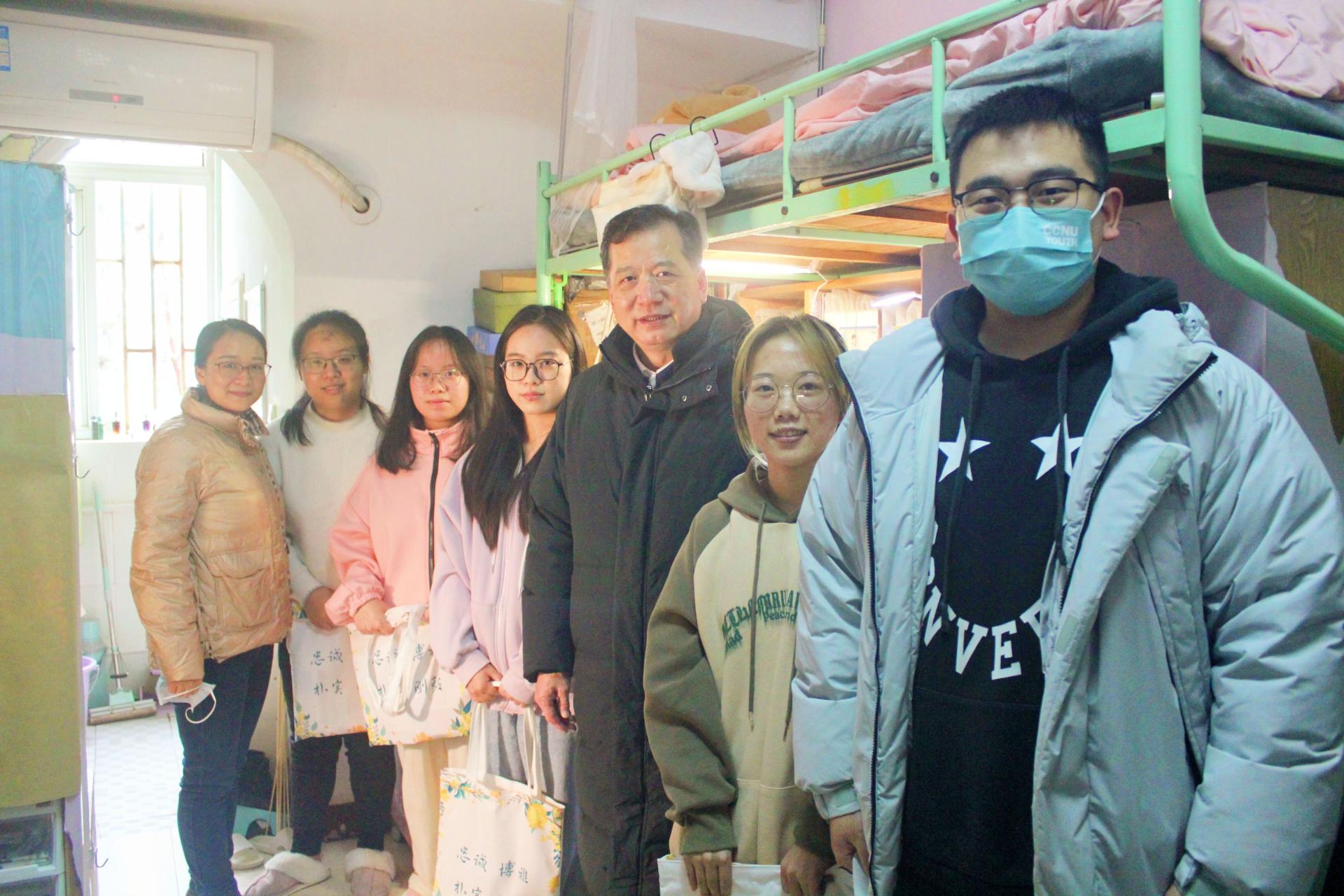 在元宝山一栋宿舍,彭校长和几位研究生进行交谈,询问他们的选题情况及本科院校,并给予同学们鼓励,希望他们在寒假期间谨慎思考,认真选题,积极与导师沟通,交流各种问题,最后祝愿他们在学业方面有所成就。