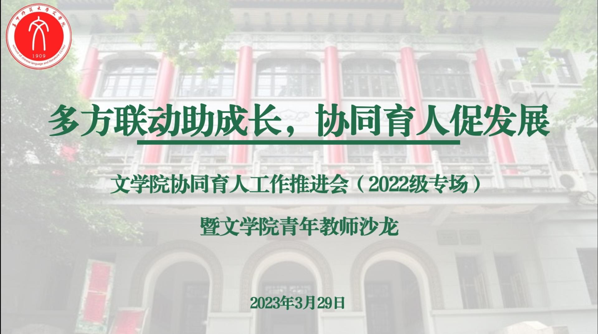 (通讯员:蒋金玉 崔宏博)2023年3月29日中午,文学院协同育人工作推进会(2022级专场)暨青年教师沙龙在学院322会议室举行。文学院党委副书记秦伟、李红雷,2022级本科生班主任及辅导员出席。