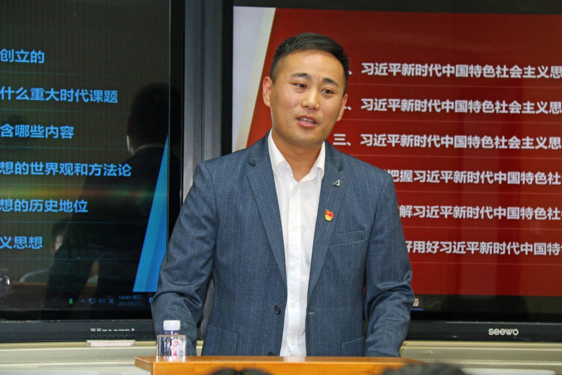 随后,包安从六个方面,多方位向同学讲解习近平新时代中国特色社会主义思想。在讲述习近平新时代中国特色社会主义思想的创立过程时,包安多次以习近平总书记的指导为例,向同学们介绍新思想的创立背景及基础,并深入讲解了“什么是新时代”“新时代意味着什么”这两个问题,展现了新思想的重要性与时代性。接着,包安向同学们讲解了习近平新时代中国特色社会主义思想在创立过程中的问题意识。包安结合生活实际,对习近平新时代中国特色社会主义思想的世界观、方法论及历史地位进行了详细地解释。他指出,世界观与方法论是习近平新时代中国特色社会主义思想的魂。