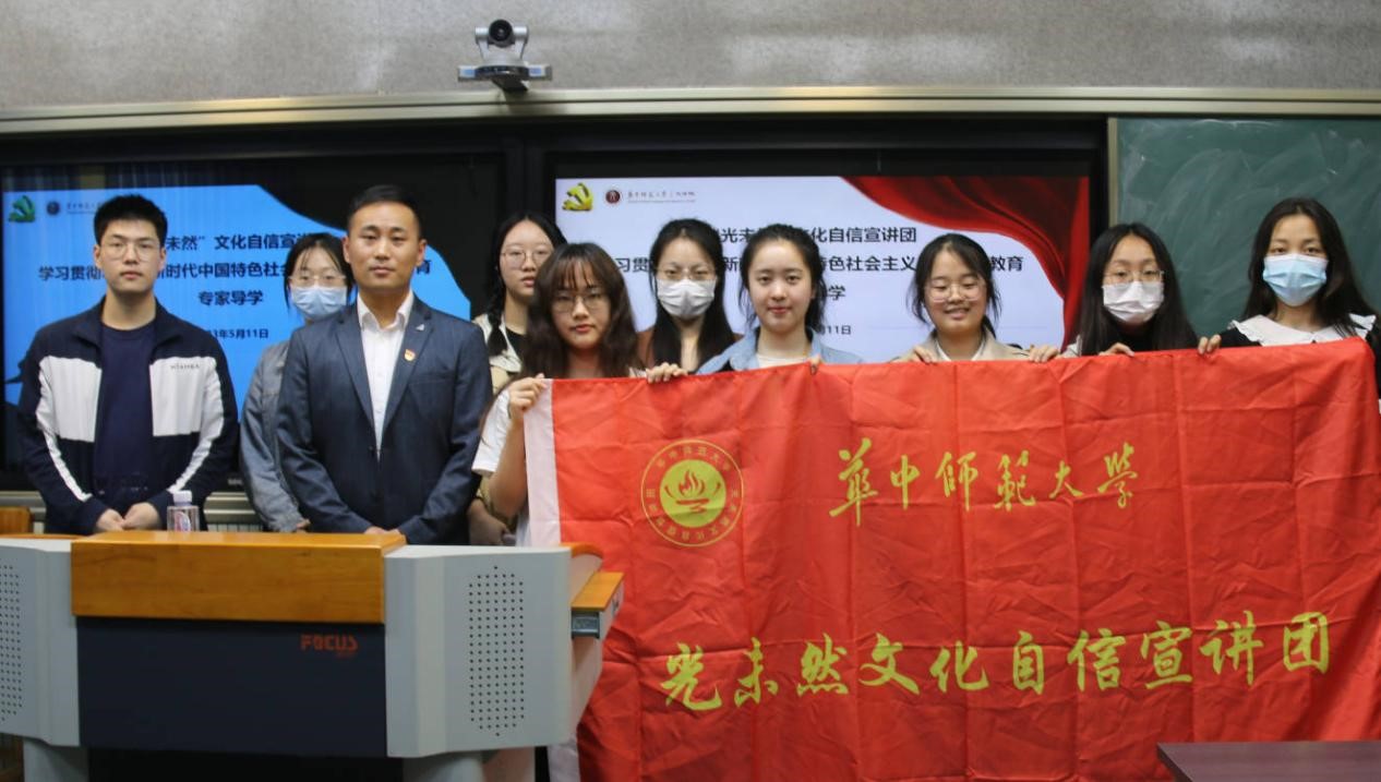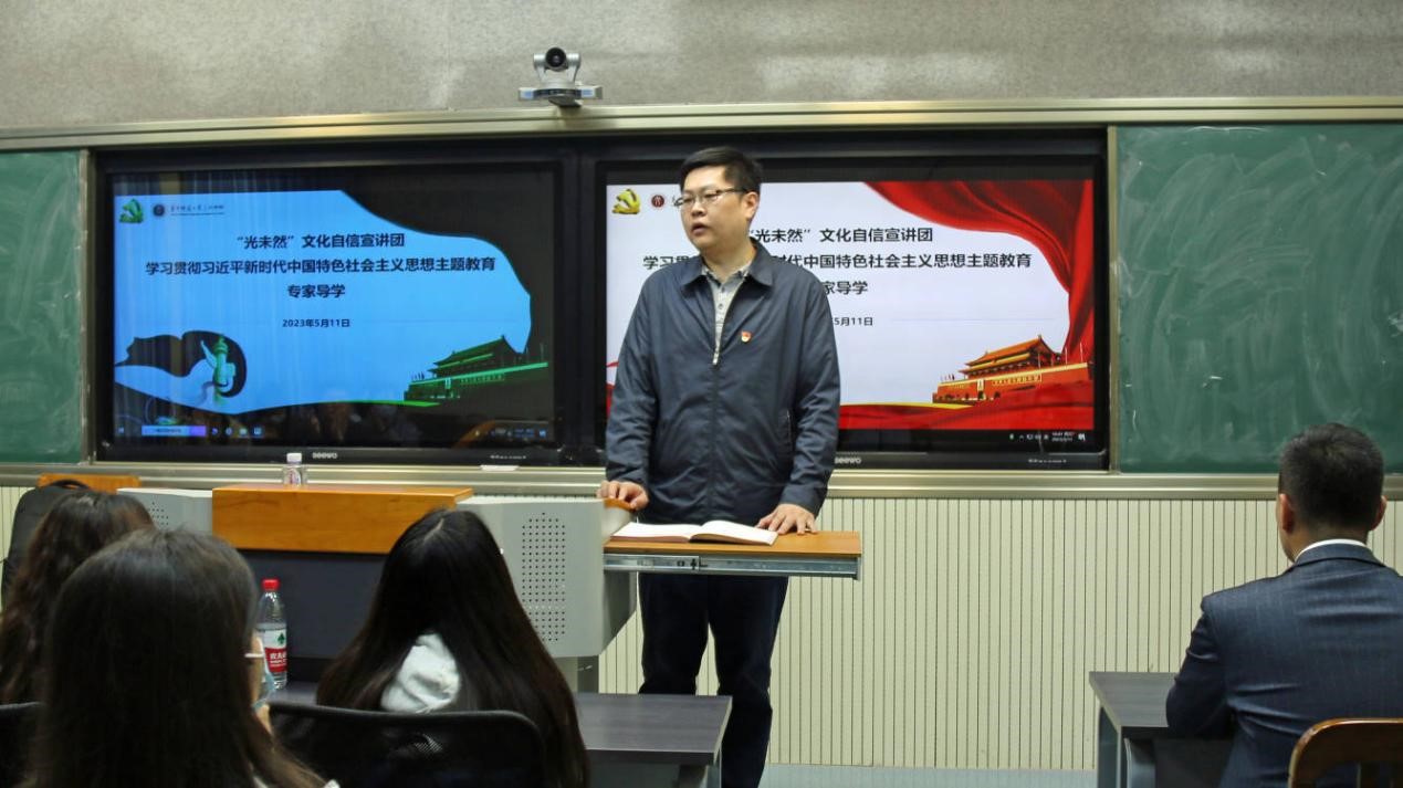 5月11日晚,“光未然”文化自信宣讲团(以下简称“宣讲团”)学习贯彻习近平新时代中国特色社会主义思想主题教育专家导学在文学院328教室开展。