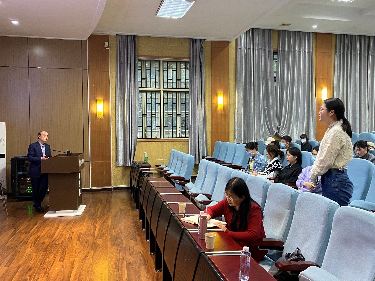 最后,在提问交流环节,在场同学就传统训诂学的现代实用性研究、国际中文教育专业面临的困境等方面提出了自己的困惑,赵老师对这些问题给予了全面清晰的解答。针对在场青年教师提出的GPT人机共生、研究的前瞻性思维培养等问题,他进一步强调观念、视野、方向三者的重要性。此次讲座循序渐进,深入浅出,引人思考,赵老师戏称自己是来邻居家做客,其语言平易如话家常却给华师文学院的师生上了一堂富有启迪和实践意义的课。至此,第10期桂子山语言学讲座在师生们的掌声中圆满结束。