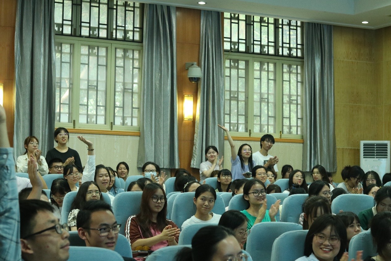 在讲座的互动环节,同学们群声争鸣,谢冕教授耐心解答,姜涛教授和高秀芹院长也一同为同学们答疑解惑。姜涛教授回应了学生诗歌伦理批评与新诗教育的问题,他指出不应强行将诗歌与伦理割裂,以谢老师的情诗集《爱简》为例讲述两者可以在人生经历与情感中兼容,他也鼓励青年师范生带领学生在课本之外领略更广阔的新诗风景。面对学生的种种现实焦虑,高秀芹院长以谢冕老师乐观坦然的人生态度开导学生,借由讲述《觅食记》《爱简》等著作的内容,她还原了一位率性、勤勉的大学者,并勉励在场学生要向谢冕教授学习,充分享受诗歌和学术带来的幸福感。老师们赞扬文学院浓厚的学术人文氛围,激励我院学子在文学路上走得广博而精深。