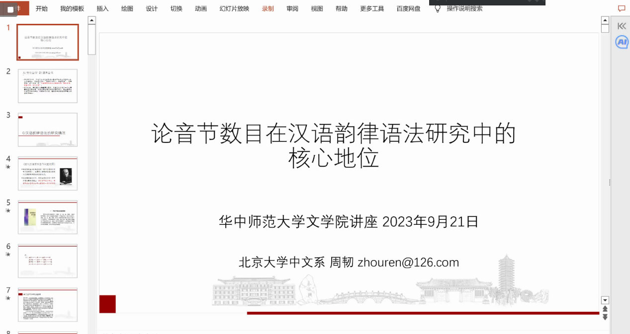 2023年9月21日晚,北京大学周韧教授应教育部第三批“全国党建工作样板支部”培育创建单位华中师范大学文学院语言学教工党支部的邀请,做了题为《论音节数目在汉语韵律语法研究中的核心地位》的线上学术讲座。讲座由支部书记张邱林教授主持。来自文学院、语言所的40余名师生参加了此次学术讲座。