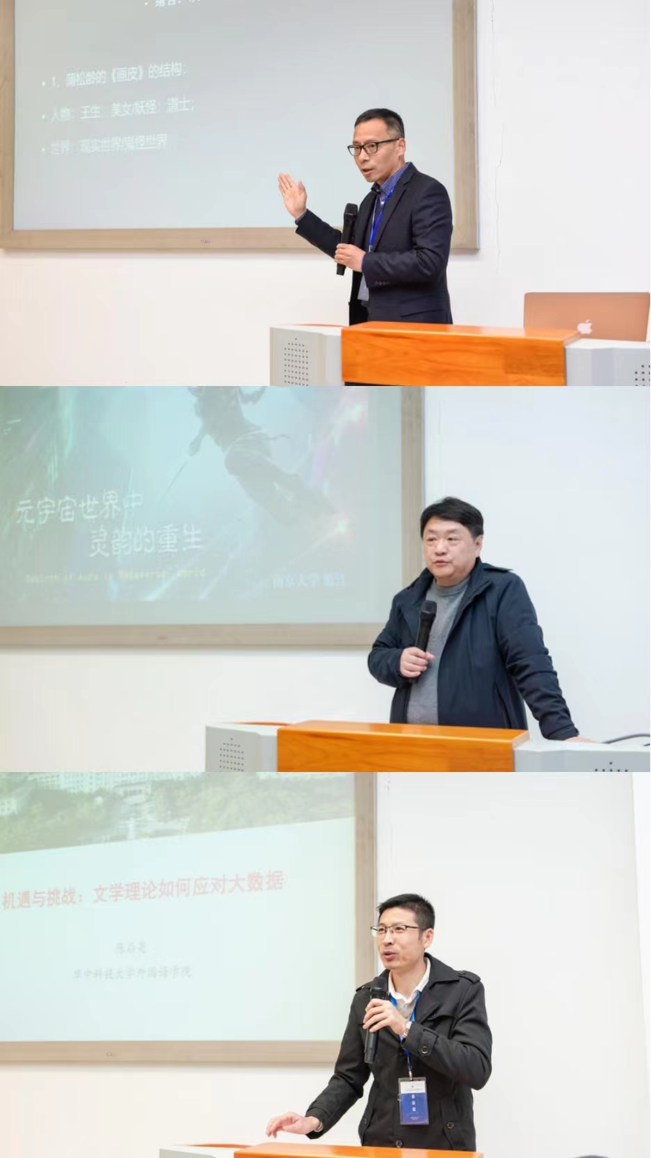 随后进入论坛的主题发言环节。第一组主题发言由华中师范大学外国语学院教授、《外国语文研究》副主编何卫华主持。同济大学中文系教授张生详细探讨了人们在社交媒体及朋友圈中的数码生存状态,南京大学哲学系教授蓝江深入分析了元宇宙世界中灵韵的重生,华中科技大学外国语学院教授陈后亮从机遇与挑战两方面,就文学理论如何应对大数据技术进行论述。