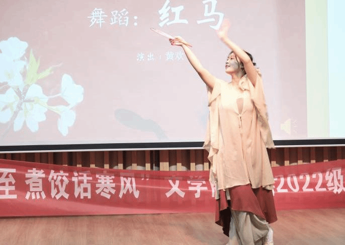 紧随其后的是载歌舞,迎冬至,冬至演出环节。现场节目形式多样、内涵丰富。有传统中国舞蹈《红马》、幽默又不失深情的诗朗诵《雪》,以及青春洋溢的合唱《素颜》等等。同学们自编自导自演,展现文学院学子多才多艺的一面。欢声笑语中,晚会气氛推向高潮,为冬日夜晚增添了一份特别的热烈。为增强活动参与感,晚会还设置了全员参与的抽奖和游戏环节,并以年级形象文创产品以及班主任郑保纯老师的刚发布的新书作为奖品。