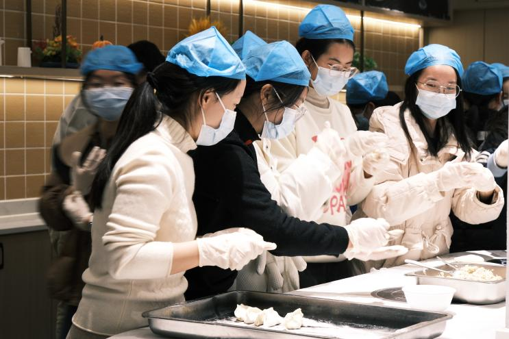 活动分为三个部分。首先,是包饺子,话冬至环节。学生们围坐一堂,在工作人员的指导下,保证卫生的前提下,亲手制作传统的饺子。在辅导员和导师们的带领下,大家掌中捏着面皮,馅心里装着欢乐,学习着和皮擀面、调馅包饺的技巧,每个人都洋溢着家的温暖和喜悦。晚会在包饺子的欢快气氛中拉开了序幕。