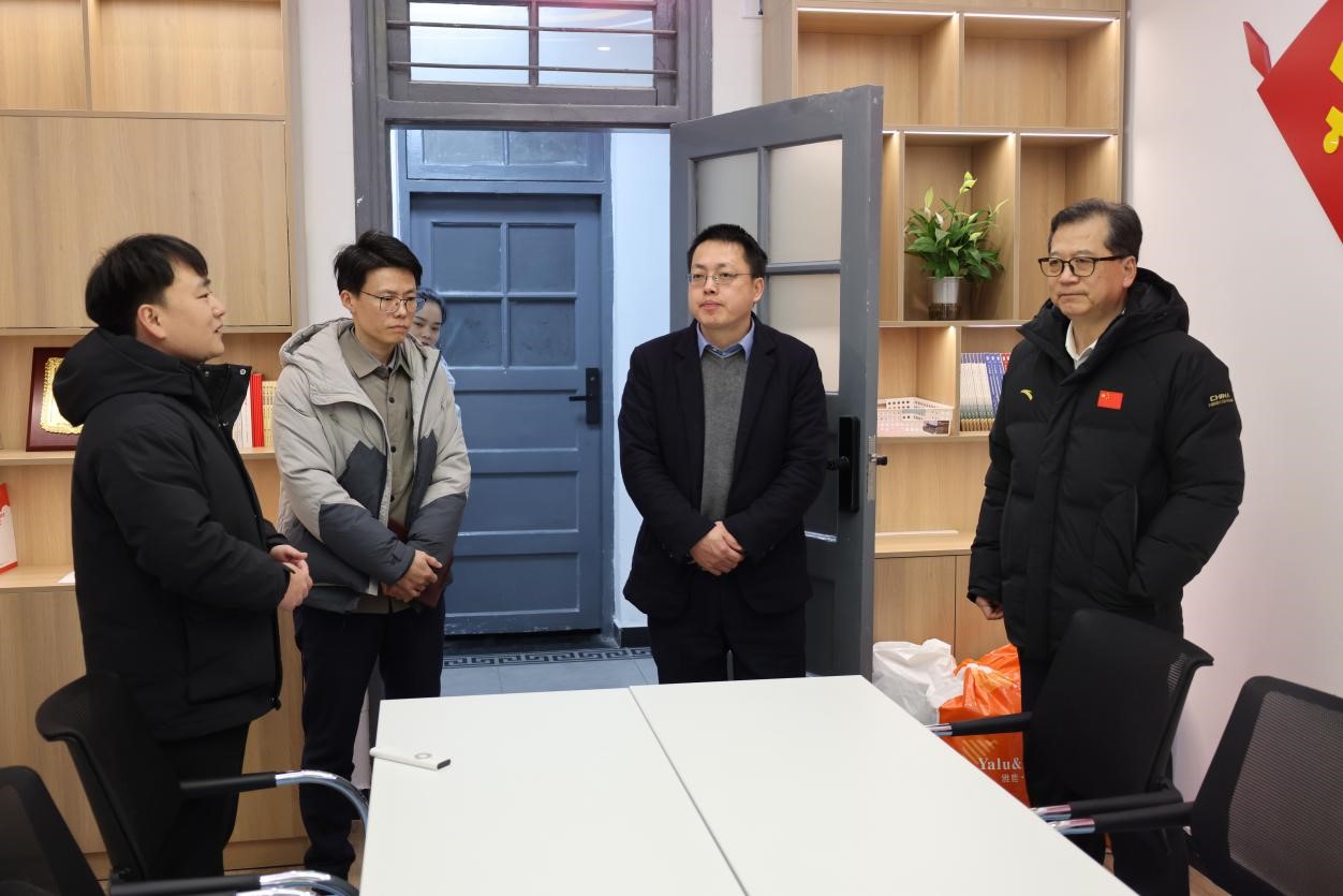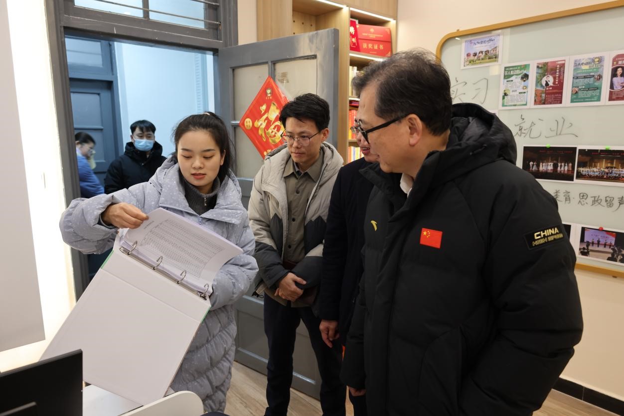 彭南生一行首先走访了西区四栋的“文小狮”美育思政工作室与恽代英党团活动室,调研学生社区建设运行情况。西区四栋学生宿舍作为“书院制”培养模式试验区,入驻了由文学院牵头建设的“一站式”学生社区,推进育人力量提升,服务学生成长成才。辅导员李哲立介绍了文学院“文”字头思政品牌创建情况和学生成长档案建设成果,展示了“弦上美育·思政留声”等特色活动和育人成效。