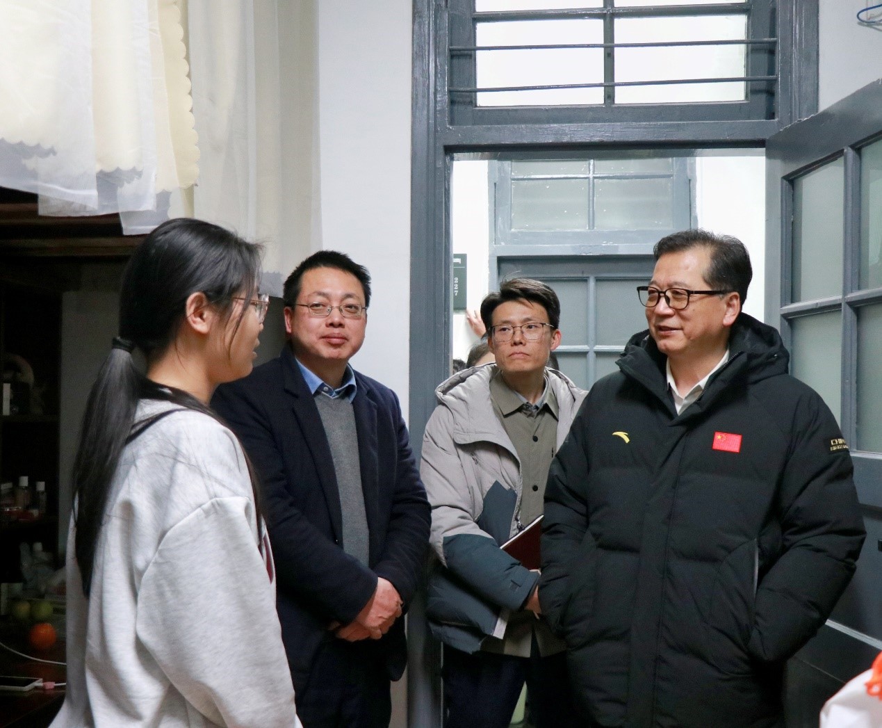 随后,彭南生一行走访了学生宿舍,了解学生学业、生活情况并赠送慰问品。走访过程中,彭南生与学生们亲切交谈,仔细询问学生们的学习情况与身体健康状况,了解学生的生源地以及大学生活的适应情况,并提醒学生们注意防寒保暖,及时增添衣物。严寒冬日,情暖到寝,送出了对文院学子殷切期盼与祝福,传递着冬日的关怀与温暖。