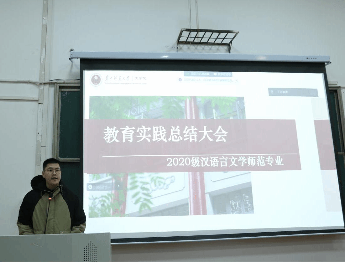 (通讯员 刘焱妮)2024年1月4日下午,文学院2020级汉语言文学师范专业教育实践总结大会在文学院2201教室举行,文学院副院长王洪涌、党委副书记桂文亮、实习研习总指导老师黄甜甜、教育实践负责人郝琴、院派指导教师代表陈蓓、2020级辅导员马骁出席本次大会,2020级师范生代表到场参会,会议由师范生王佳豪主持。