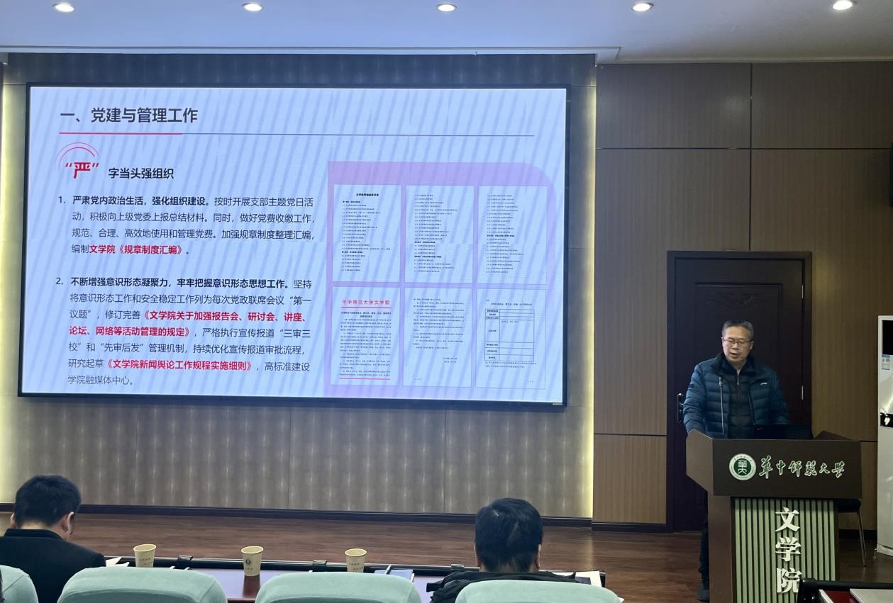 随后,文学院院长刘云作《文学院2023年度工作报告》,报告从党建与管理、学科建设、人才培养、科学研究、师资队伍建设、学生思想政治教育六个方面对2023年学院工作及取得的成绩进行了总结。