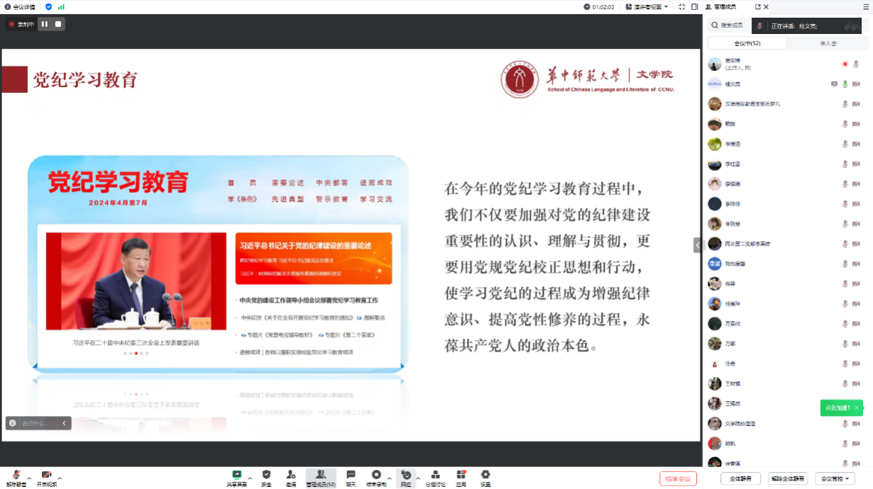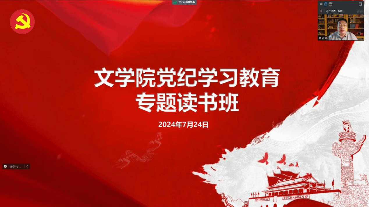 (通讯员 崔宏博 袁瑞磷)7月24日,文学院在线举办巩固拓展主题教育成果暨党纪学习教育专题读书班,文学院党委委员、领导班子成员、全体党支部书记、纪检委员和政工干部参加,读书班由文学院党委书记张舜主持。