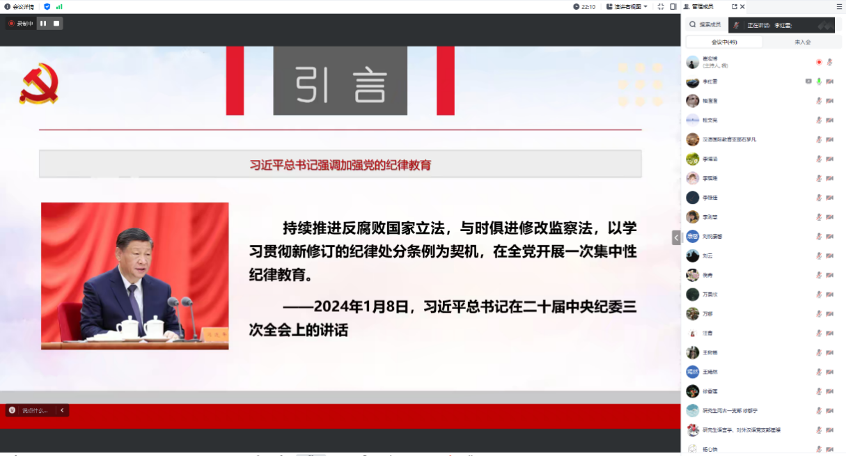 桂文亮结合丰富的案例和工作实际进行领学,介绍了本次党纪学习教育的重大意义,强调了学院广大党员同志应继续巩固拓展学习贯彻习近平新时代中国特色社会主义思想主题教育成果,建立健全以学铸魂、以学增智、以学正风、以学促干的长效机制,推动学院党纪学习教育走深走实。