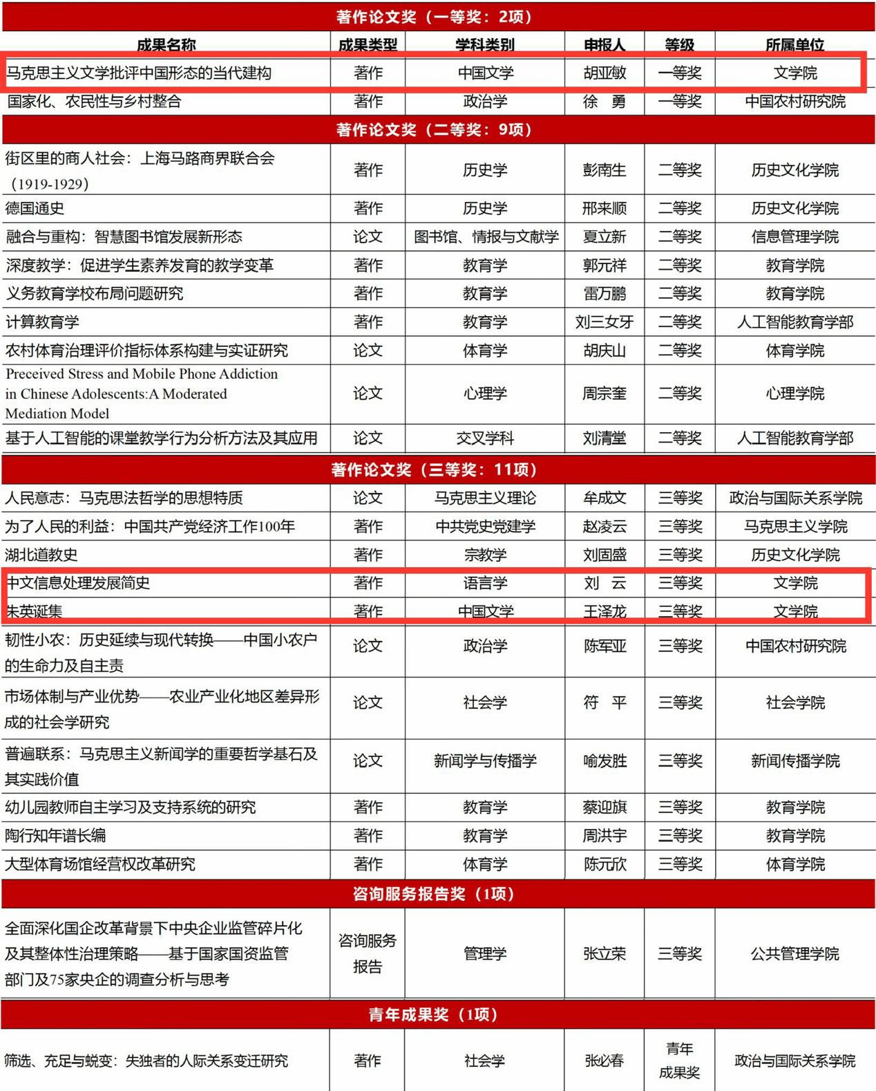 文学院讯(记者 洪亚琳)近日,教育部正式公布第九届高等学校科学研究优秀成果奖(人文社会科学)获奖成果名单。华中师范大学共24项成果获奖,文学院共3项成果获奖。其中我院胡亚敏教授著作《马克思主义文学批评中国形态的当代建构》获评著作论文奖一等奖,刘云教授著作《中文信息处理发展简史》、王泽龙教授著作《朱英诞集》获评著作论文奖三等奖。