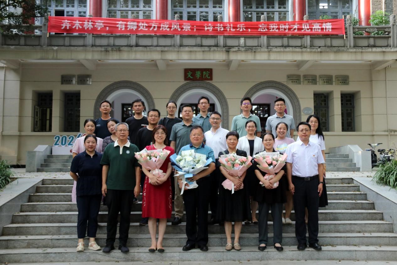 天色将晚,座谈即尽,与会成员在文学院门口合影留念。“莫道桑榆晚,为霞尚满天”,退休教师们的辛勤付出和育人精神将激励后辈教育工作者赓续传统、继往开来,为教育事业贡献持续力量。