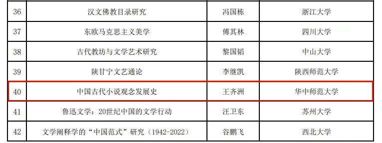 文学院讯(记者 徐榕微)近日,全国哲学社会科学工作办公室公布了2024年度《国家哲学社会科学成果文库》入选名单,文学院王齐洲教授主持完成的研究成果专著《中国古代小说观念发展史》入选。这是王齐洲教授入选《文库》的第二部专著,2013年王齐洲教授的研究专著《中国古代文学观念发生史》首次入选《文库》。
