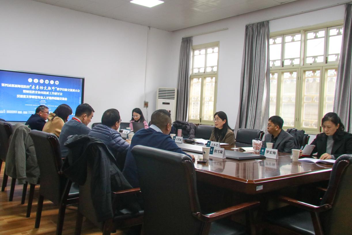下午,汉语言文学师范专业人才培养暨师范教育协同提质经验交流会在文学院322会议室召开,文学院专业负责人王洪涌教授主持会议。陕西师范大学文学院副院长周广干教授、东北师范大学文学院党委副书记吴晓庆、西南大学文学院副院长张春泉教授、遵义师范学院人文与传媒学院院长罗宏梅教授、黔南民族师范学院文学与传媒学院副院长朱广黔教授分别发言,围绕师范生人才培养、优师计划建设、创新育人体系、培养应用型人才等方面分享了经验。