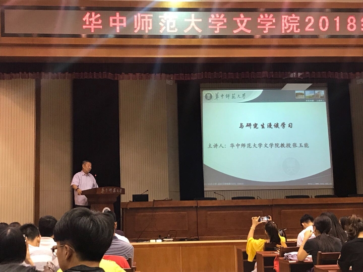 接着,张玉能教授与新生们就“漫谈学习”这一主题进行了交流。他从自己的学习生涯和教学经历出发,向新生们抛出了此次谈话的论点:研究生的任务就是“研究性学习”,是一个发现问题、提出问题、解决问题的过程。接下来,他详细阐述了如何研究问题的方法:其一是元方法,即哲学方法;其二是学科的方法,也就是借鉴各门学科的知识来解决难题;接着,他强调了学习哲学和美学理论的重要性,从哲学思辨的角度教导学生们如何认识文学作品和文学发展状况,从而捍卫文艺的崇高精神,履行一个文院学子的文艺使命;随后,张教授为新生们贡献了毕业论文选题的建议,提出要选取最感兴趣和最有积累的题目,选取导师所熟悉的领域、选取具有理论价值、有利于本专业发展、具有现实意义的关键问题。最后,他也对同学们提出了“要做一名有思想、有学问的研究生”的美好展望。