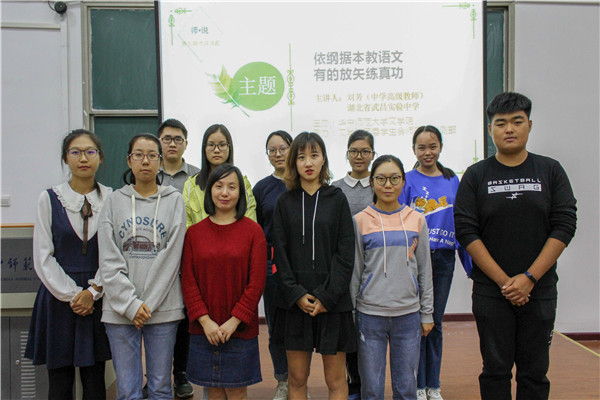 (通讯员:周家名 陈小天)10月12日晚,由华中师范大学文学院主办,文学院团委学生会师范生训测部承办的第七期“师说”讲座于文学院2201教室开展。本次讲座由湖北武昌实验中学高级教师刘芳担当主讲人,刘芳以“依纲据本教语文,有的放矢练真功”为主题,向同学们讲授语文教学经验。师范生训测部指导老师汪青出席了本次活动。