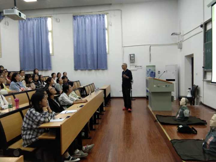李铭老师先从“空姐顺风车遇害案”入手,给同学们尤其是女生讲解了出行安全。他用一段突发紧急状况的小视频吸引了同学们的注意力,让同学们意识到危险就在我们身边,应对此类事件早做准备方不会手忙脚乱,避免酿成大祸。紧接着,他用PPT图文并茂地阐述了生活中常见的受伤事故,如流鼻血、割伤等意外状况的治疗方法,矫正了同学们相关的知识误区,如“流鼻血应该是头往前倾而不是往后仰”等等。李老师还穿插了一些自身参与急救的故事和典型案例,激发了同学们的兴趣