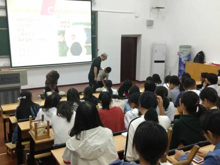 讲座中最吸引同学们的部分莫过于模拟演练了。两位老师运用道具,同学们自告奋勇地上台,先是练习如何正确地进行人工呼吸,包括跪姿、找准按压位置、按压力度与幅度、按压频率等。两位老师示范了如何使用急救设备,并且反复叮咛其中的注意事项和适用人群。由于这项环节存在一定的危险性,因此没有邀请同学上台尝试。