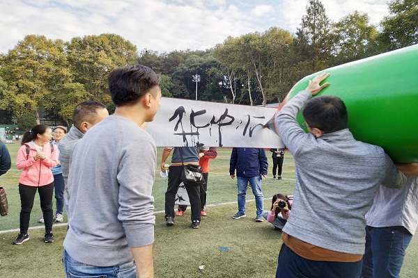 四位老师齐心协力,控制巨大的充气笔,在画布上一笔一划写下“华中师大”,负责道具的老师为他们助力,配合默契,颇具看点。赛后老师们合影留念,至此校运会教职工趣味项目赛落下帷幕。