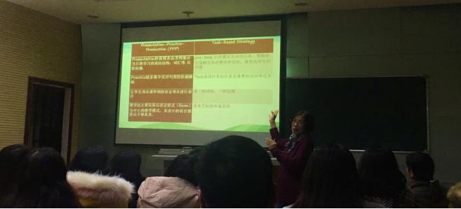 在21日下午的讲座中,刘梅媚博士向大家详细介绍了美国青少年汉语教学现状,包括美国外语课程要求、美国青少年课堂教学流程模式、教学法的使用等具体内容。刘老师首先向大家引出了美国现在普遍使用的外语课程“5C”要求,即Communication、Connections、Comparisons、Communities、Cultures。美国的外语教学课程均须严格按照这个“5C”标准来设计。随后,她又详细介绍了同学们普遍关注的美国课堂教学流程。刘老师介绍到,在美国的青少年汉语课堂中,汉语老师的教学通常遵循“I Do”、“We Do(Collaborative)”、“We Do(Guided)”、“You Do”四个步骤:“I Do”环节通常是老师通过视频、歌曲、图片、实物等辅助教学工具为学生提供语言输入材料,让学生们初步接触、了解新知识; “We Do”环节则是老师指导及合作学习;“You Do”环节主要让学生独立思考、进行展示。在教学法的选择上,由于面对的学生大多是零基础的美国儿童,刘老师建议汉语老师最好使用目的语进行沉浸式教学,减少学生对母语的依赖。