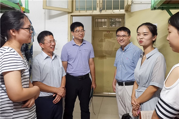(通讯员 李锐欣 邹迅)8月31日下午,秉持着全员育人、全程育人、全方位育人的精神,华中师范大学文学院分党委书记朱庆海,院长刘云,分党委副书记秦伟、徐福刚,副院长余一骄,2019级辅导员李哲立、刘汉骄为贯彻落实德智体美劳“五育”并举的要求,来到了新生宿舍看望已顺利报到的新同学。