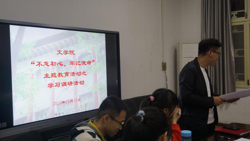 当前,“不忘初心、牢记使命”主题教育活动正在深入开展。为了切实贯彻落实文件会议精神,文艺学与马列文论会联合支部与文艺学研究生党支部,于2019年10月10日晚在文学院三楼会议室联合开展了“不忘初心、牢记使命”的主题教育活动之学习调研活动。活动由文艺学与马列文论会联合党支部宣传委员王海龙与文艺学研究生党支部书记孙铭主持。两个支部的教师党员和学生党员、积极分子齐聚一堂,围绕着初心使命、本职工作及追梦圆梦等方面展开了讨论与交流。