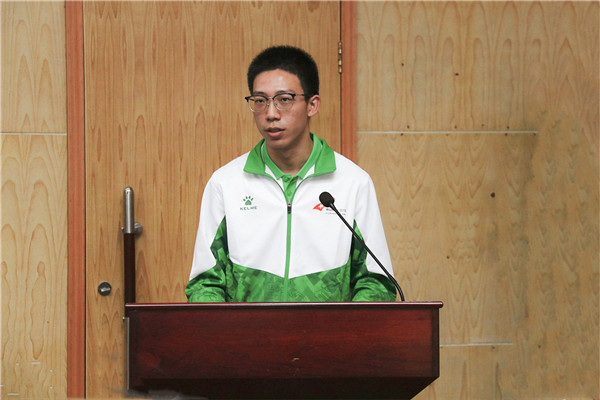 大会第一项,朱庆海书记致辞。他首先对报名军运会志愿者的同学们表达了衷心谢意,并对同学们的奋斗精神给予了肯定。同学们为了军运会的幕后工作牺牲了暑假及部分专业课的时间进行培训,并且在高标准严要求的选拔中脱颖而出,这次经历不仅是对他们能力的肯定,更是他们成长路上的一份宝贵财富。此外,他提出,这是军运会首次在中国举办,这里的志愿者们代表着中国,代表着武汉,代表着华师,也代表着文学院,希望同学们能充分展示当代大学生的风采,正如宣传语所言“争当志愿者,服务见真情”,做到既严肃又活泼。最后,他表示,学院也会做好后勤保障工作,确保志愿服务工作顺利开展。