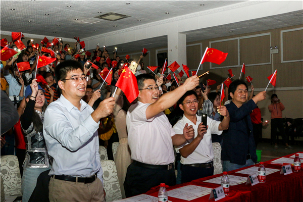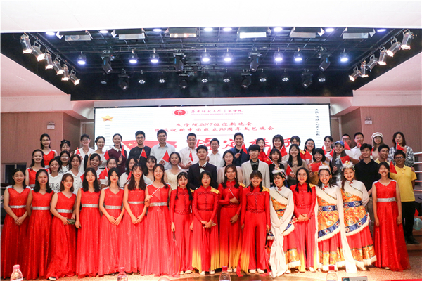10月7日晚,“情定桂子,心系阿中”文学院2019级迎新晚会以丰富多样的艺术形式礼赞祖国。整场晚会由缘聚桂子山,文我一曲远和阿中永挂怀三个篇章组成,共12个节目,囊括歌舞,相声,话剧等表演形式。朗诵《华夏千年,赤心永随》融合了诗歌,书画等传统元素,向祖国告白,优美的诗词、华美的汉服与遒劲有力的书法作品相互交融,彰显传统文化的魅力。当《我和我的祖国》的音乐响起,全体师生起立,挥舞着手中的国旗,伴随音乐共同唱响这首对祖国的赞歌。