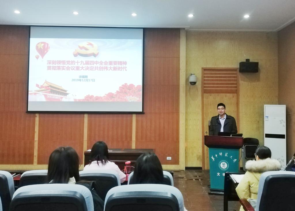 (通讯员:鲍思琦)2019年12月17日下午,文学院本科生第一党支部于文学院一楼报告厅开展十九届四中全会主题党课教育,文学院党委副书记徐福刚为支部成员上党课,支部正式党员、预备党员及发展对象到场参加。