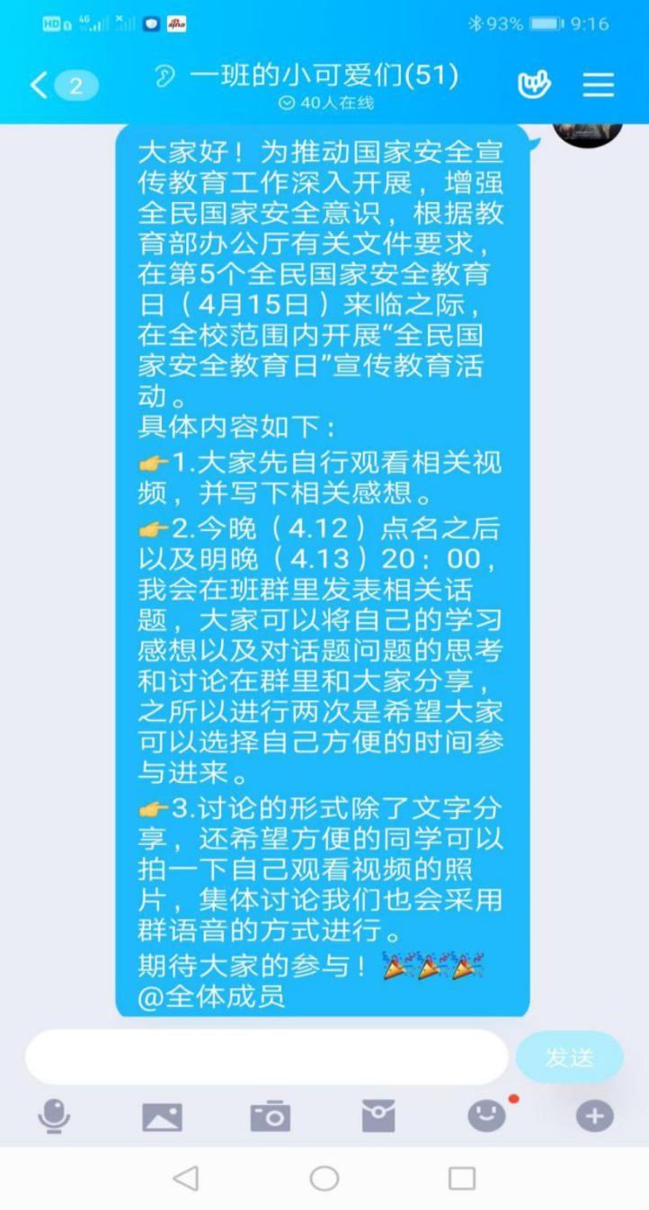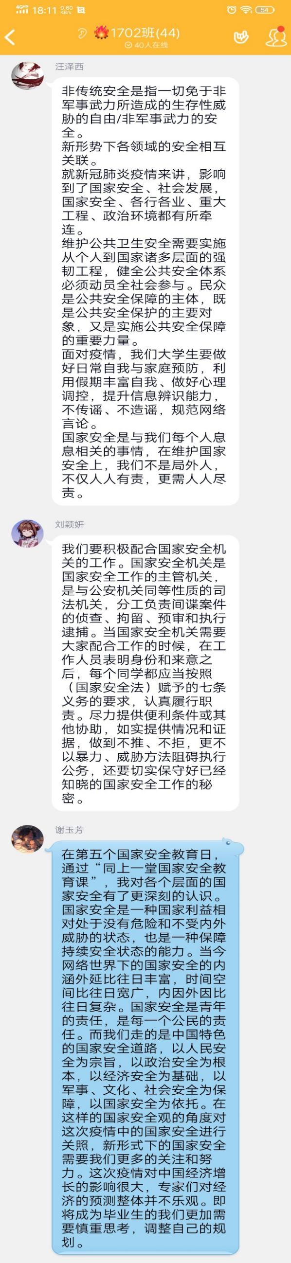 在前期宣传中,各年级在线上积极动员学生,有序组织了本次学习活动。4月14日,各年级辅导员老师在年级群进行了“全民国家安全教育日”宣传教育活动,给大家分享了国家安全教育的相关学习资料,在年级群里叮嘱大家认真学习15日的国家安全教育课,疫情期间,要通过对国家安全教育课的学习,深入地了解和掌握国家安全相关法律知识,增强自我的国家安全意识,提高维护国家安全的自觉性,维护国家安全从自身做起。并且各班团干部上传下达,做好了组织落实工作,把学院、年级要求落实到班,促进活动有序开展。